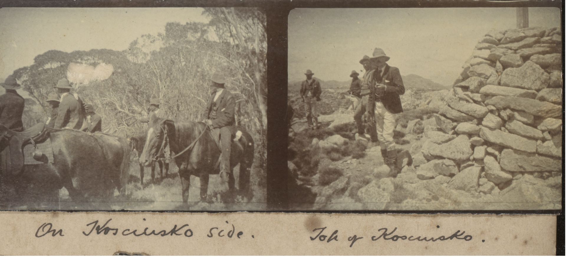 ‘Their station at Bringenbrong, was within a day and a half ride of the summit of Kosciusko, and the brothers often made a camping trip to the top of the mountain with pack-horses. It would be hard to imagine any more typically Australian trip, for the journey started down the Murray Valley, where the melted snow ran over beds of sparkling pebbles. On the trip through the Murray Gates, the Leatherbarrel, and Tom Groggin, tourists were so infrequent that the walleroos would sit on rocks and hardly bother to get out of the road as the cavalcade went by. Dingoes followed the expedition for miles, possibly hoping that something edible would be dropped from the packhorses, lyrebirds (locally known as pheasants) were as thick as fowls in a barnyard.’