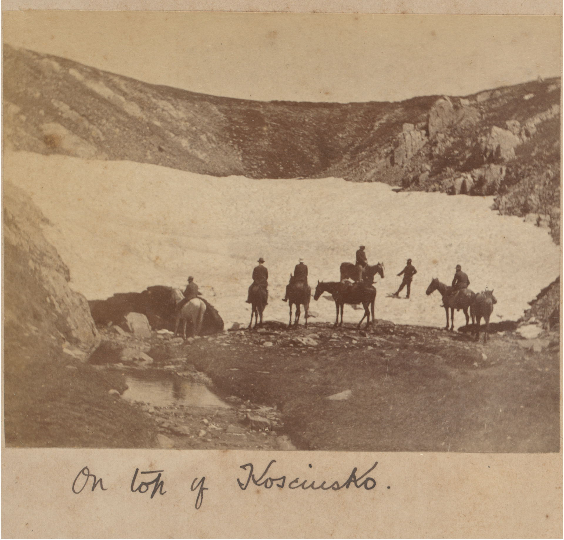 Paterson’s observations about the quagmires on Mt Kosciuszko suggest that either the topography of Kosciuszko has changed in over a century. There are no quagmires on the Summit now. It is possible that Paterson’s concept of Mt Kosciuszko was rather elastic and included a larger area of the High Country. The photograph showing a group of horsemen and drift of snow and captioned ‘On top of Kosciusko’ doesn’t appear to be an image of the summit of Kosciusko which would suggest that Paterson’s concept of Mt Kosciuszko was rather elastic and included a larger area of the High Country than just the Summit of Kosciuszko.